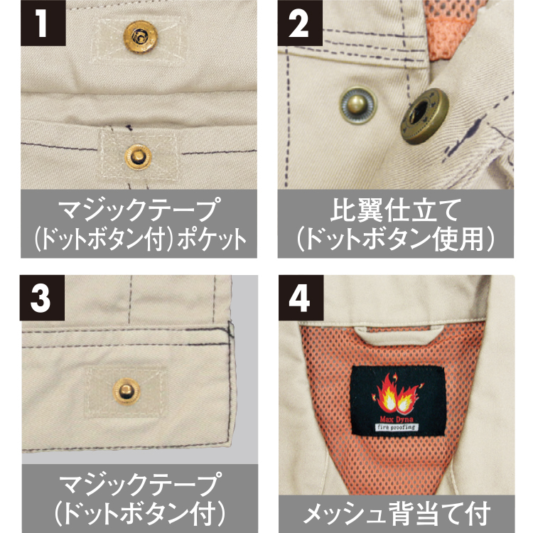 優れた防炎性により、火気を扱う作業現場において高い安全性を求める、ニーズに応える防炎製品、それが「Max Dyna」です。炎や熱に対して着火せず、炎が上がることがありません。また記事が溶融しないので、肌に付着することでおこる火傷も防ぎます。防炎機能だけでなく、軽さや丈夫さ、耐洗濯性、着心地のよさなど作業服としてのこだわりのディティールも、半世紀にわたり作業服を作り培ってきた当社ならではの、技と知恵が凝縮されています。